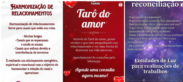 Através da leitura de tarot, cartas de búzios e práticas espirituais, ofereço um caminho de clareza, cura e equilíbrio para todas as áreas da sua vida. Não realizo trabalhos que envolvam o mal, minha missão é sempre elevar, purificar e atrair as melhores energias para aqueles que buscam auxílio.